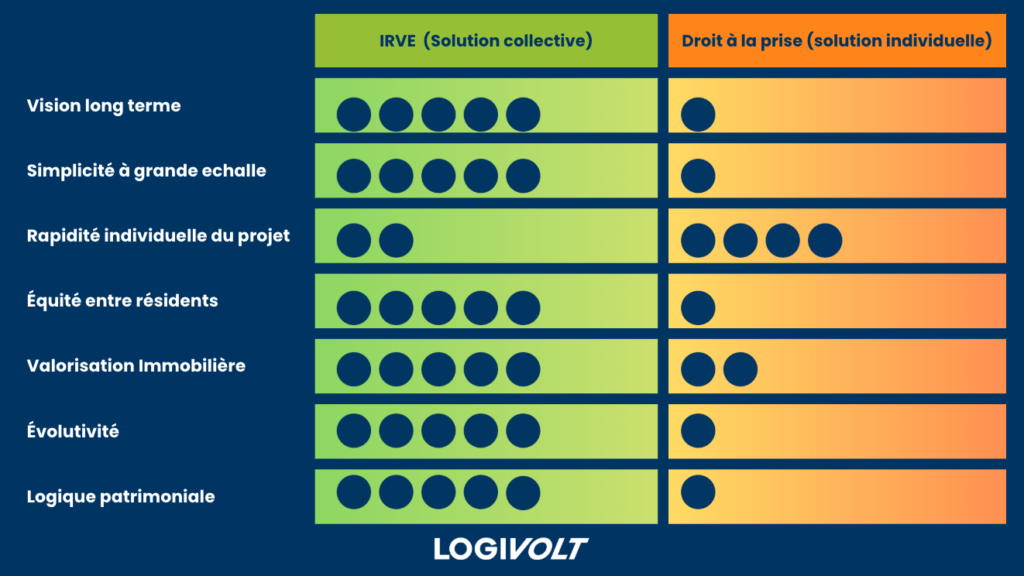 💡 Le droit à la prise est surtout une solution pertinente à titre individuel ou pour les petites copropriétés, les usages ponctuels ou comme solution transitoire avant un projet d’IRVE.
